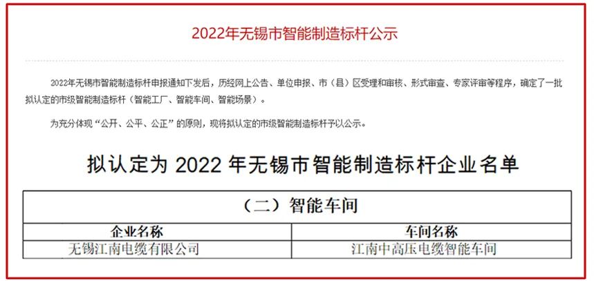 江南電纜入圍2022無(wú)錫市智能制造標(biāo)桿