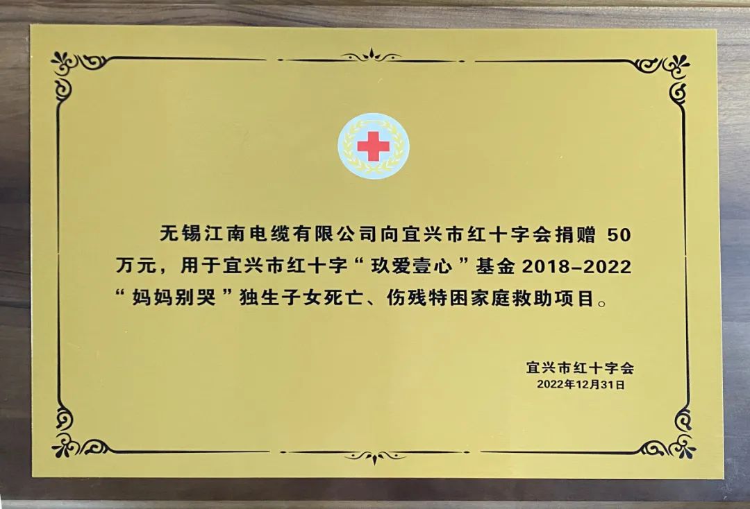 三十八年如一日,江南電纜堅持公益、筑夢行善,獲得了社會各界的高度肯定:江蘇省紅十字奉獻獎、無錫市紅十字功勛獎,公司總經(jīng)理儲輝榮獲首屆無錫慈善獎最具愛心慈善捐贈個人……張張證書、樁樁善舉、拳拳愛心,為江南蓬勃發(fā)展注入不竭的精神動力!